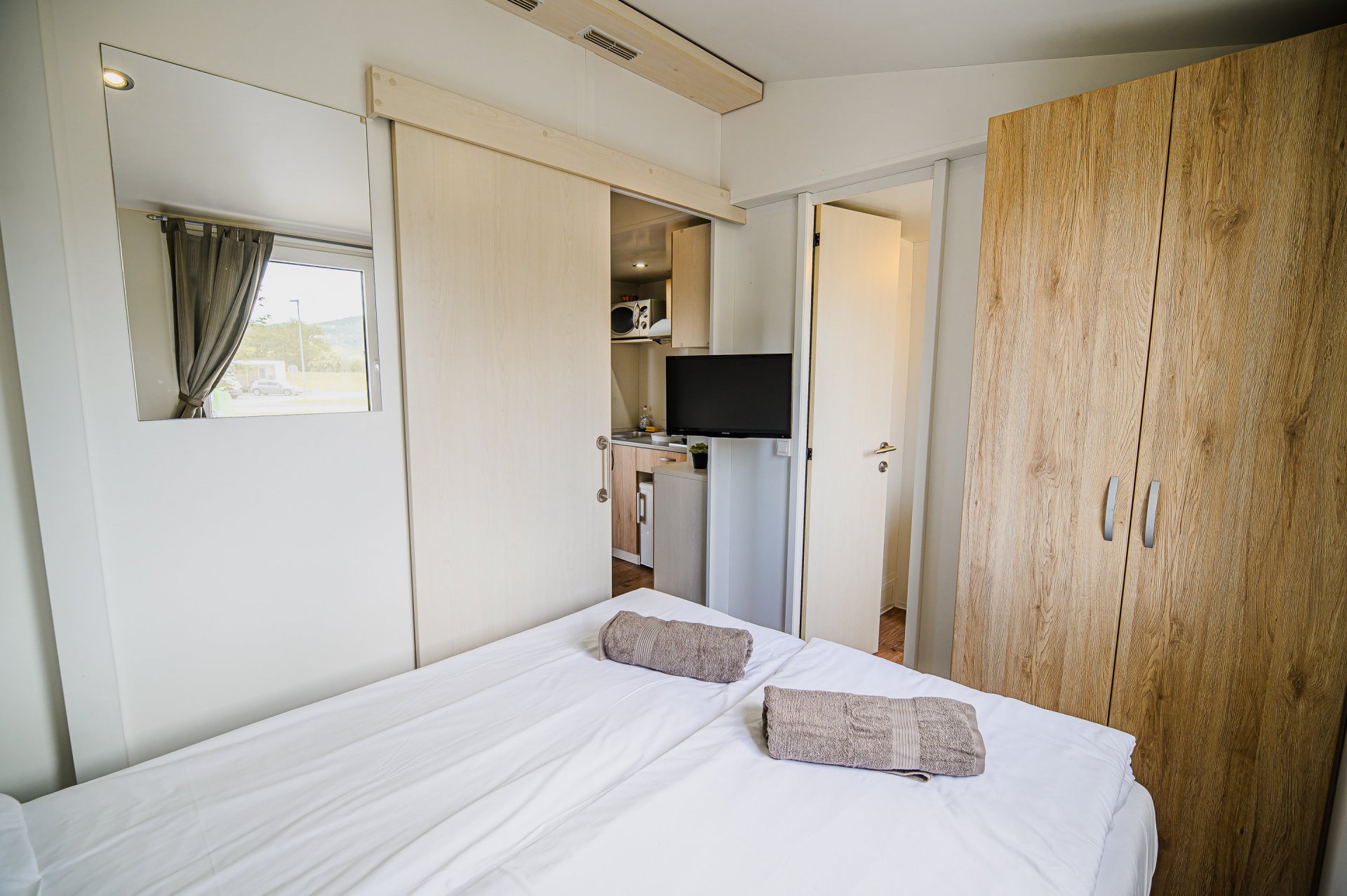 One-bedroom mobile home suitable for up to 2 adults and 2 small children (0-5 years old). Additional bed is 140x200cm big. Thermal Riviera tickets are included in price for all guests all days of your stay (SUMMER SEASON: 2 x daily entrance per person for summer thermal riviera unlimited time or 1 x daily entrance per person for winter thermal riviera - 3 hour ticket. WINTER SEASON: 1 x daily entrance for winter thermal riviera unlimited time). Mobile Homes are located near lake in autocamp Terme Čatež. Distance to Thermal Riviera is 150-200m.